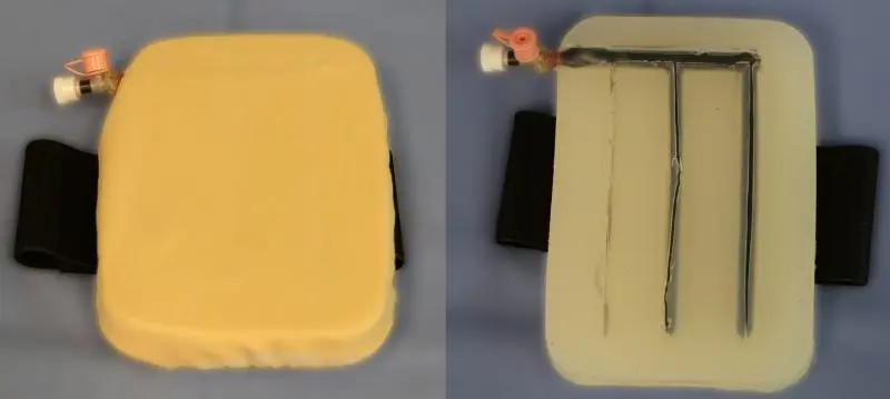 Ez a puha anyagú, felszíjazható párna 3 vénát tartalmaz. Felszíjazható a karra vagy a kézhátra. Elsajátítható készségek: Tűvel történő szúrás Kanüllel történő szúrás A vérfolyás kezelése A vénák lumeneinek mérete: 1mm, 4mm, 6mm |